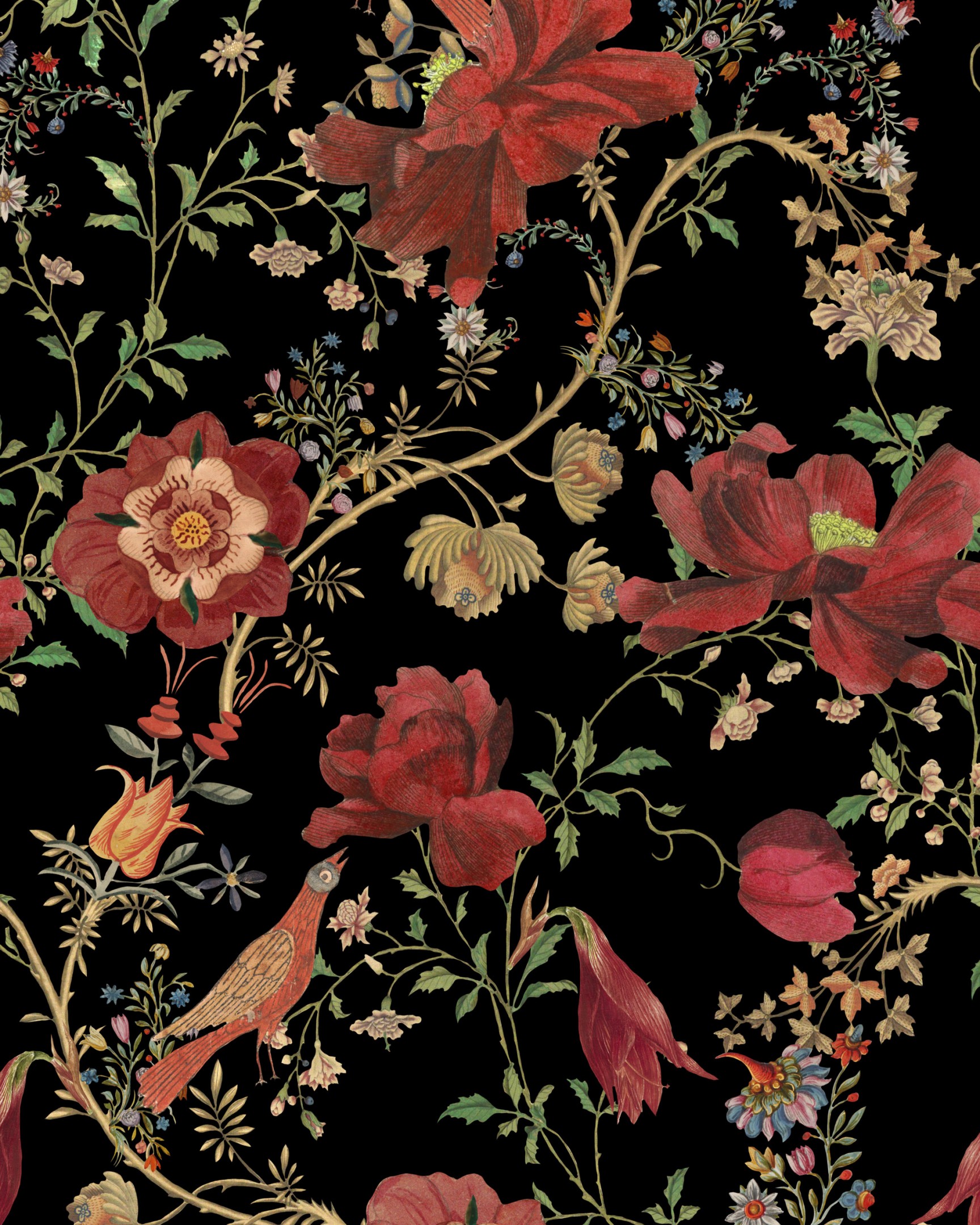 Reflectând biodiversitatea bogată a pământurilor noastre istorice, nuanțele strălucitoare de visiniu, purpuriu și cupru învăluie delicatele garoafe, crizanteme și gălbenele de mlaștină într-un tapet unic. Designul emplematic al florii este disponibil pe un fundal taup stins, precum și pe unul intens întunecat.