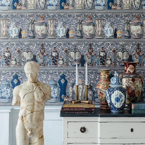 Rafturi pline cu comori antice, CERAMIC WONDERS aduce un omagiu priceperii olarilor antici. Respirați mirosurile Drumului Mătăsii cu bucăți de porțelan îmbrăcate în promisiunea și mistica orientală și admirați frumusețea și meșteșugurile individuale din spatele fiecărui vas. De la peisaje îndepărtate până la animale târâtoare și flori exotice, fiecare obiect expus este acoperit de narațiune, spunându-și povestea în mișcarea și mișcarea unei pensule. Disponibil într-o nuanță deschisă sau întunecată, modelul este susținut de un indigo și alb floral tradițional ceramicii, sporind efectul tridimensional al tapetului și permițând borcanelor și ghivecelor de toate formele și dimensiunile să se amestece simultan în fundal și să stea mândru.
