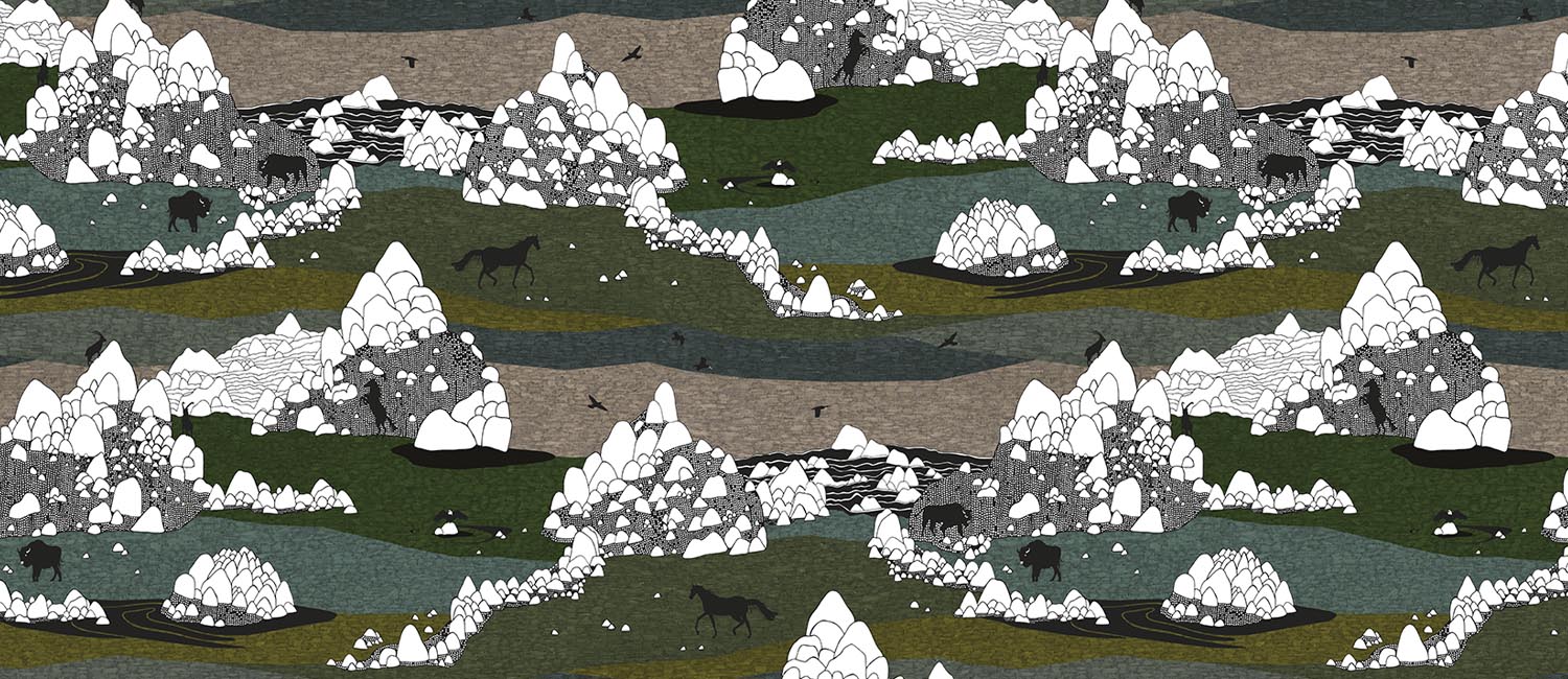 Tapetul Grands Espaces este o asociere neașteptată între canioane colorate fără perspective și forme concrete inspirate de scoici albe și negre. Un western grafic și abstract depopulat de oameni care invită la imaginație între trăsături de creion și degrade.