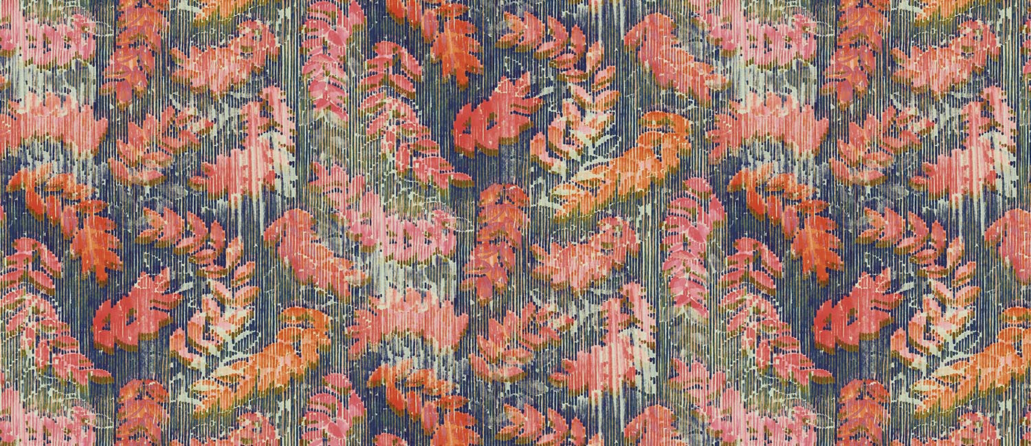 Motivul Rameaux recreează spiritul unei tapiserii cu efect uzat, sporit de modernitate prin acorduri de culori vibrante și uneori acide.