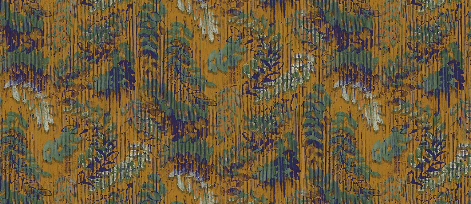 Motivul Rameaux recreează spiritul unei tapiserii cu efect uzat, sporit de modernitate prin acorduri de culori vibrante și uneori acide.
