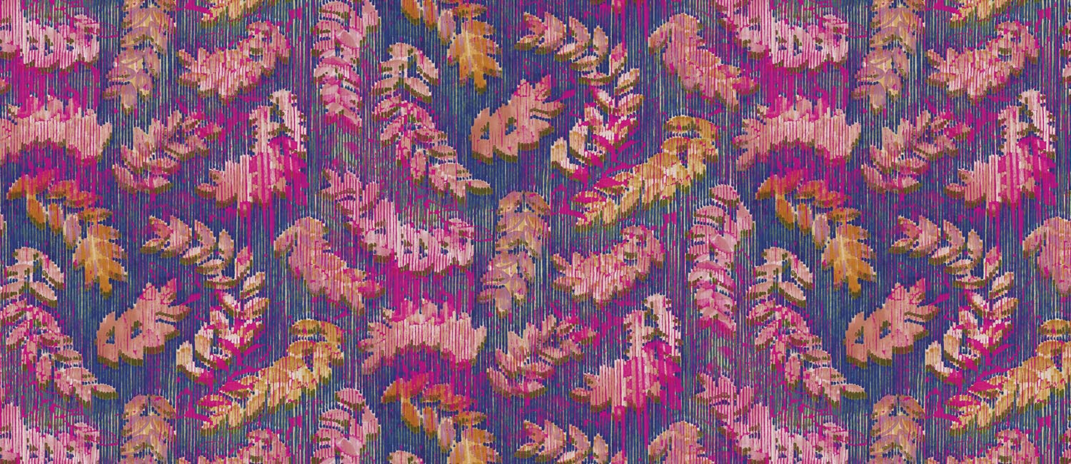 Motivul Rameaux recreează spiritul unei tapiserii cu efect uzat, sporit de modernitate prin acorduri de culori vibrante și uneori acide.