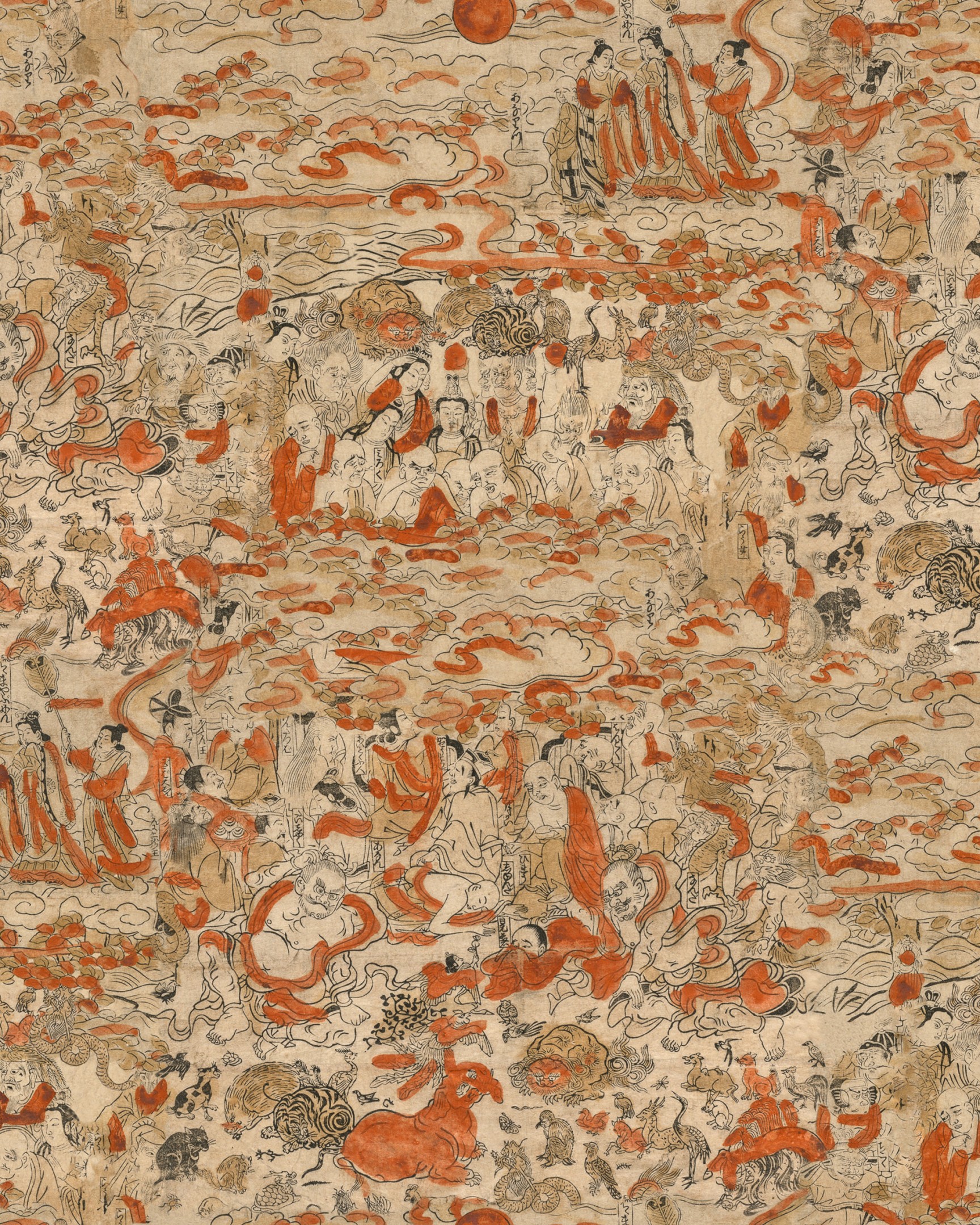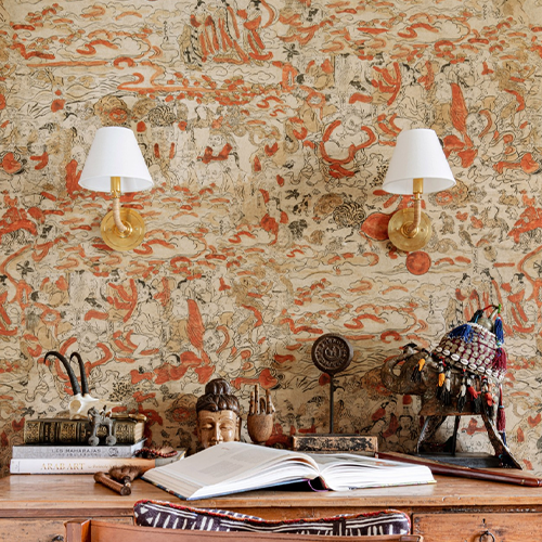 Apropiați-vă puțin – de departe tapetul nostru SPIRITURAL JOURNEY poate părea un model abstract, dar la o inspecție mai atentă, veți descoperi o mulțime de personaje desenate manual care trăiesc viața pe un fundal bej pal printre pete de culoare. Plutind ca fumul sau ceața, un ton ruginit, portocaliu, își navighează în jurul oamenilor, plantelor, animalelor, norilor și caligrafiei, toate acestea fiind ilustrate ca simple desene în stil chinezesc antic. Fă-ți timp să cutreiere fiecare centimetru și să te cufunzi într-o multitudine de povești împletite cu talent una în alta și care așteaptă să fie descoperite.